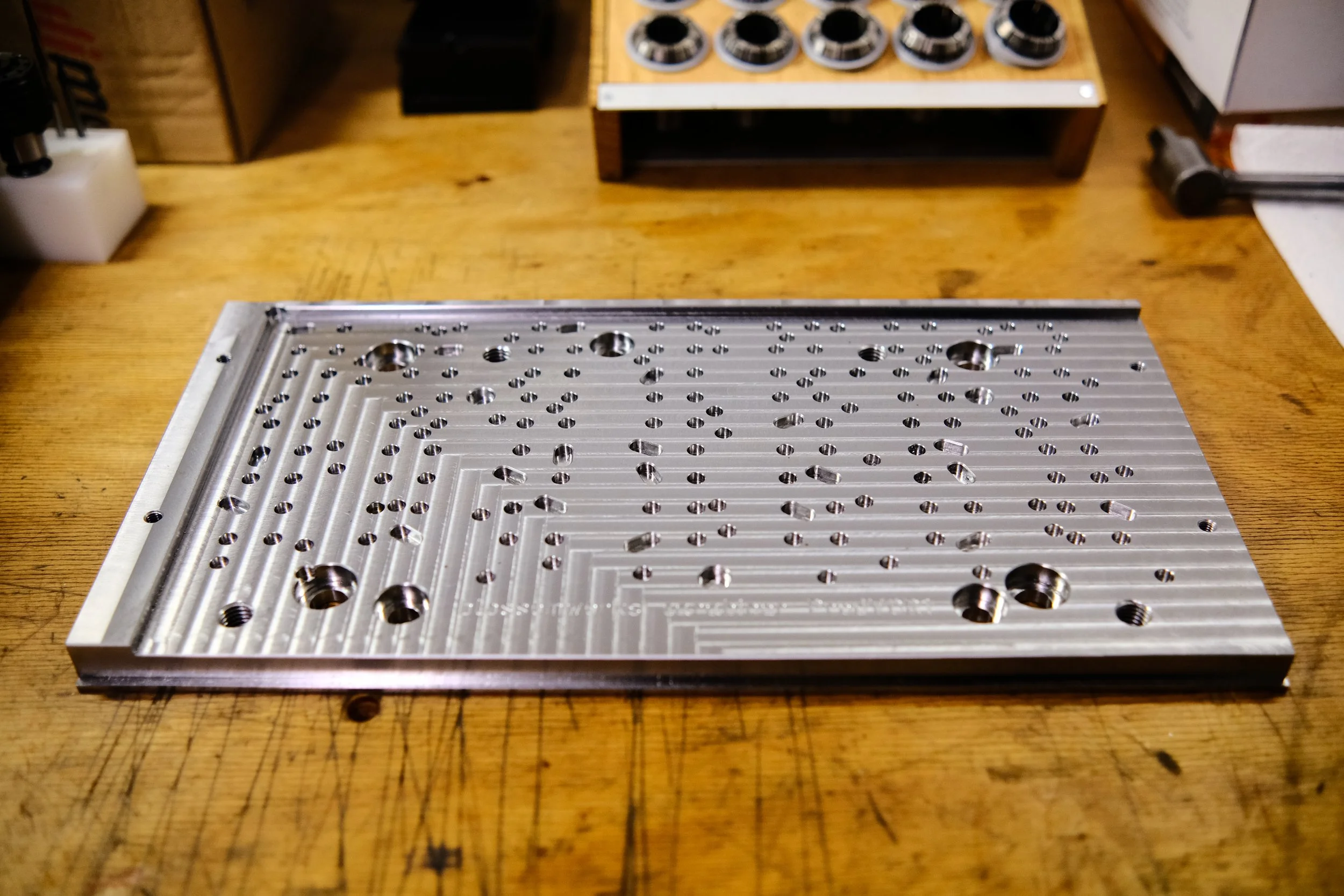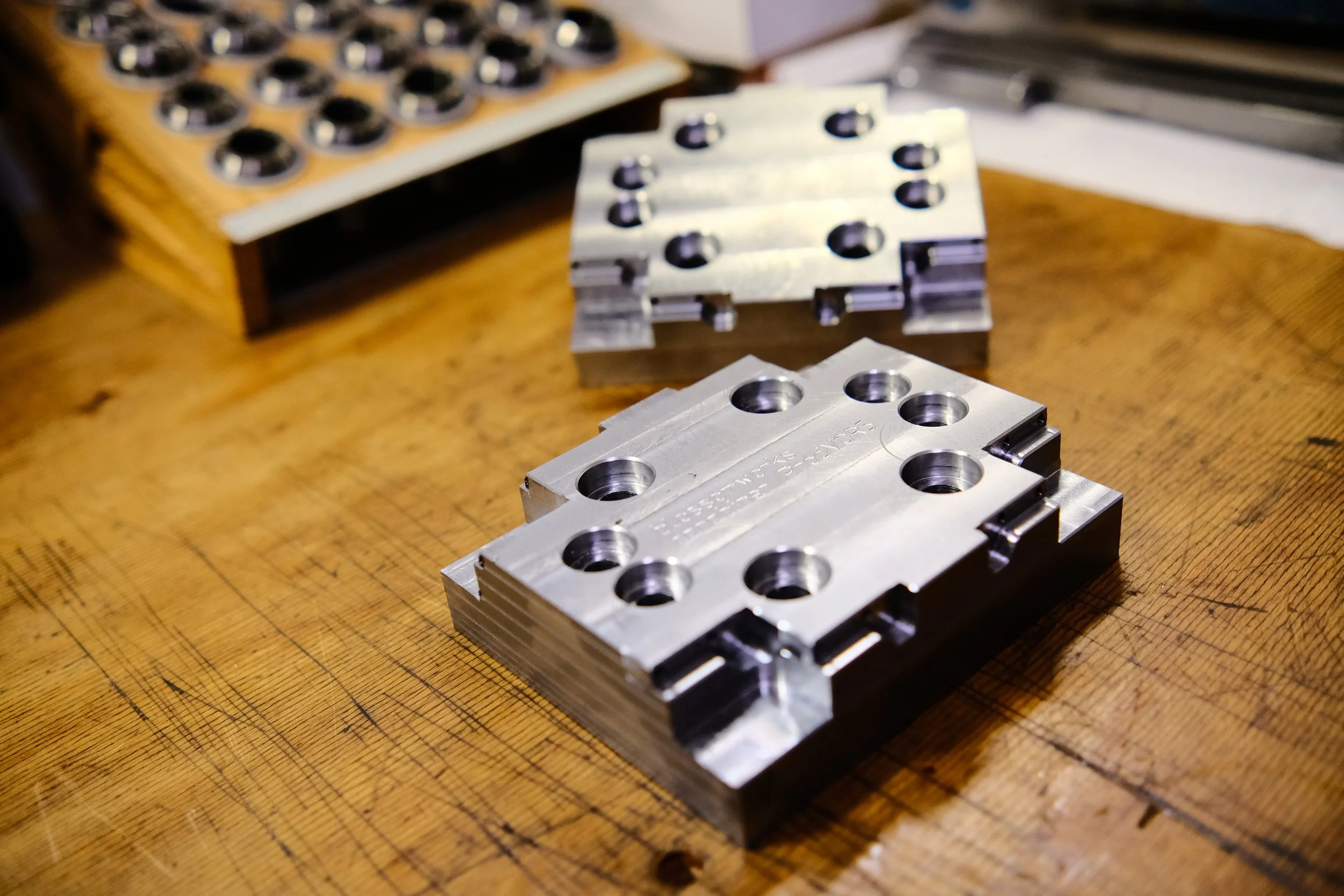 Die blossomworks Karabiner sind ein Eigenprodukt und zeigen die mögliche Effizienz einer fräsenden Fertigung mit Vorrichtungen in Kombination mit Nullpunktpaletten. So wird bei einer klassischen Fertigung im Schraubstock pro Zyklus nur ein einziges Rohteil verarbeitet. Wenn die Zykluszeit wie bei den Karabinern kurz ist, kann der Maschinenbediener während dem Programmlauf kaum für andere Tätigkeiten eingesetzt werden. Es gilt demnach die Laufzeiten zur erhöhen und den Durchsatz zu steigern.